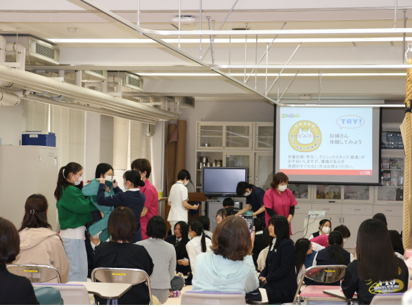 両親学級に参加する妊婦になって、妊婦体験、妊娠・出産・赤ちゃんに関するクイズ、赤ちゃんのお世話を体験してみよう。